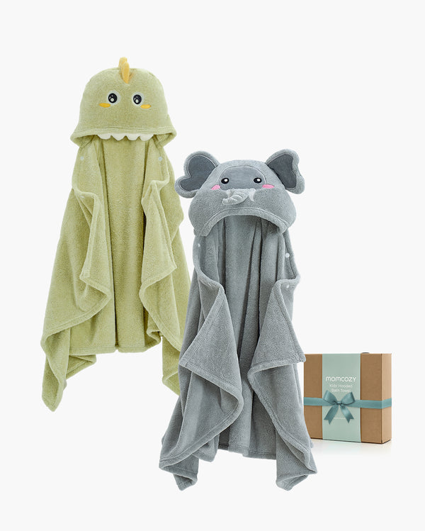 The Momcozy Baby Hooded Towel stands out as a 2-pack set of ultra-soft towels that are highly absorbing for efficient drying along with post-bath cuddles.