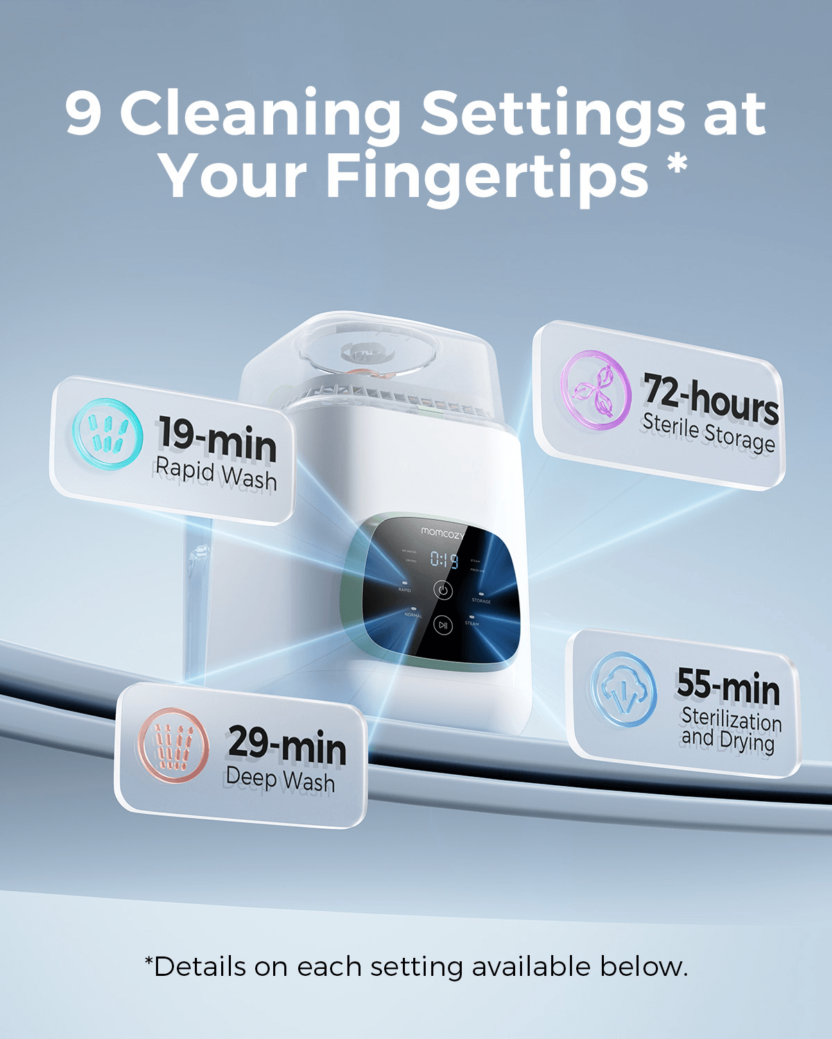 These 9 modes make the Momcozy KleanPal Pro a versatile and advanced cleaning solution, surpassing most standard bottle washers by offering tailored options for different cleaning needs.