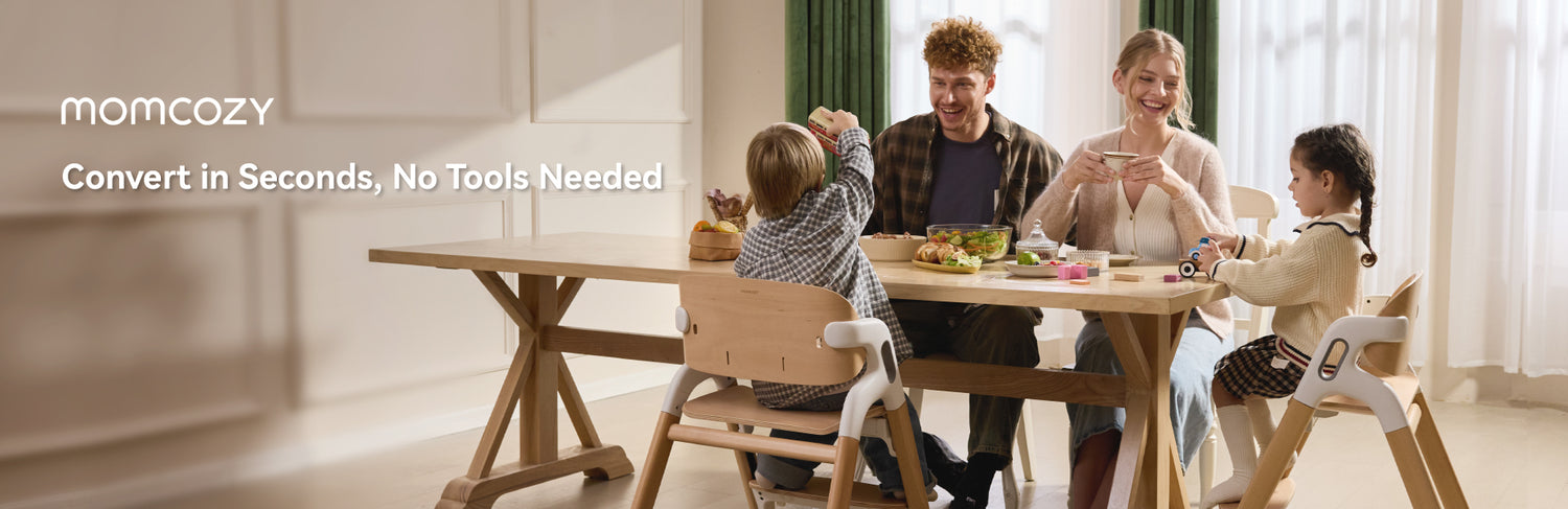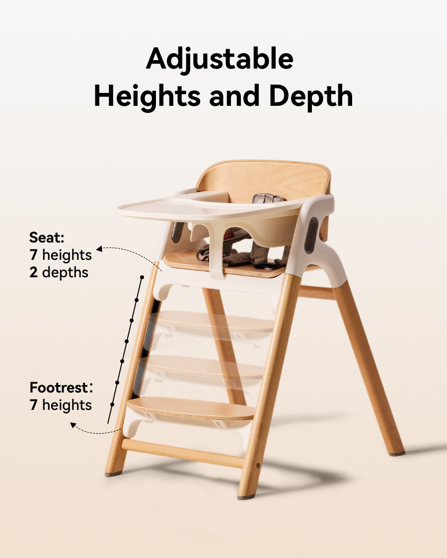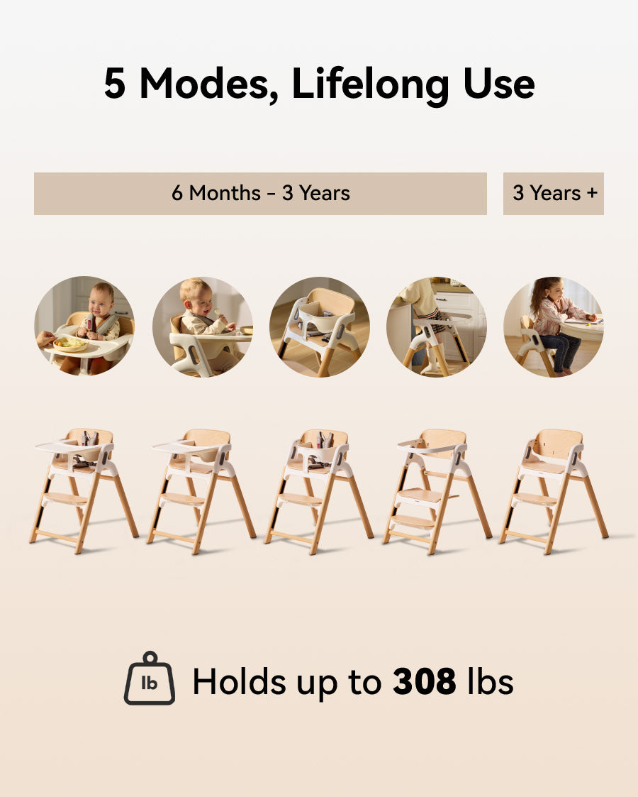 Momcozy DinerPal High Chair, designed to grow with baby from 6 months through adulthood, offers 5 seating modes from baby set to adult chair and supports up to 308 lbs. With adjustable seat and footrest positions, it ensures ergonomic comfort at every stage. Safety features include a five-point harness, stable triangular frame, and silicone rubber feet. The spacious, dishwasher-safe tray fits most suction bowls, and the chair is easy to clean with a wipeable surface and machine-washable harness. Built with quality FSC-certified beechwood and FDA-approved plastic to protect baby's health and for your peace of mind.