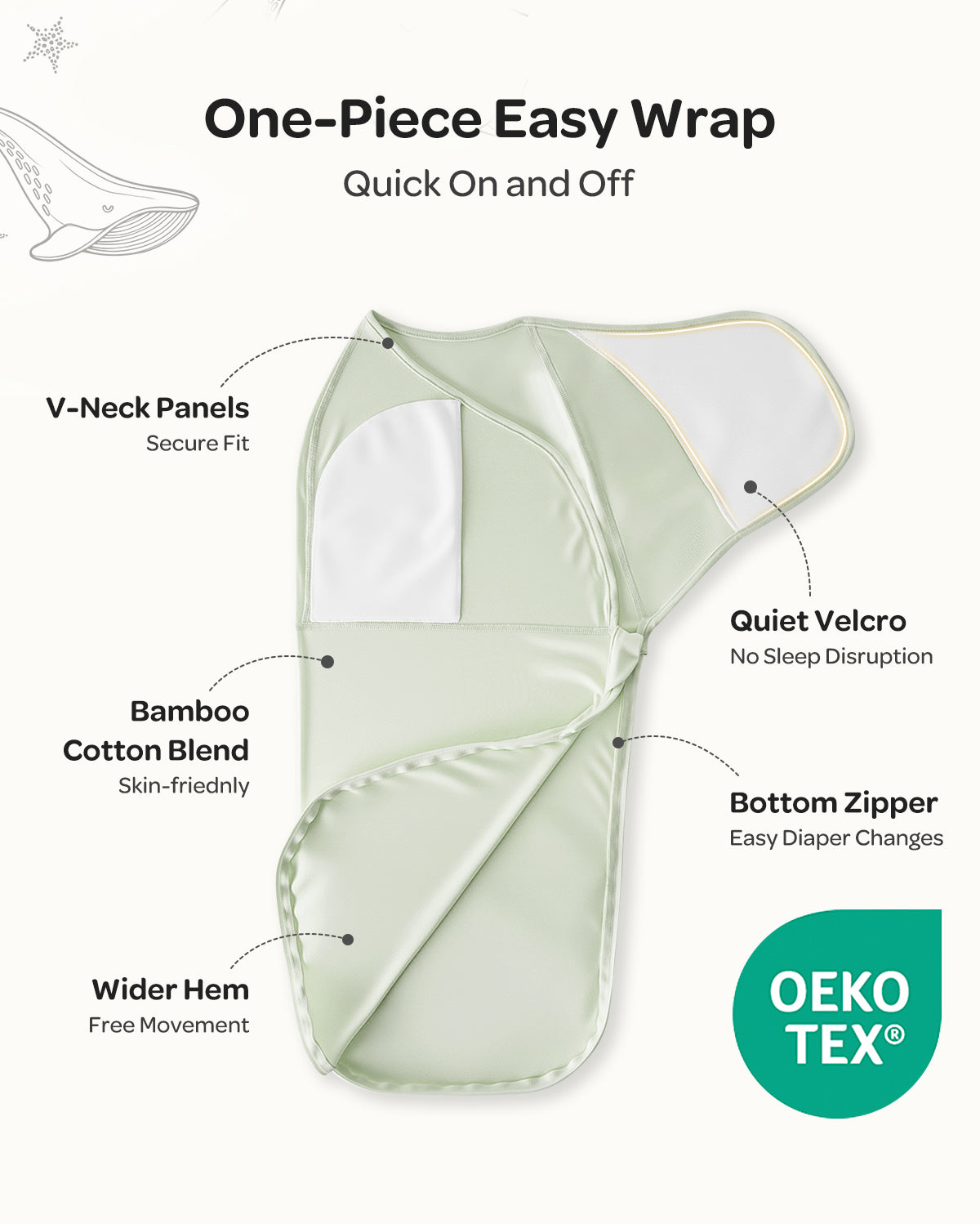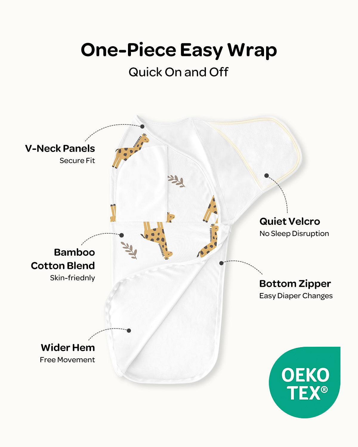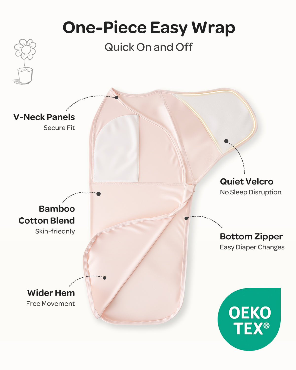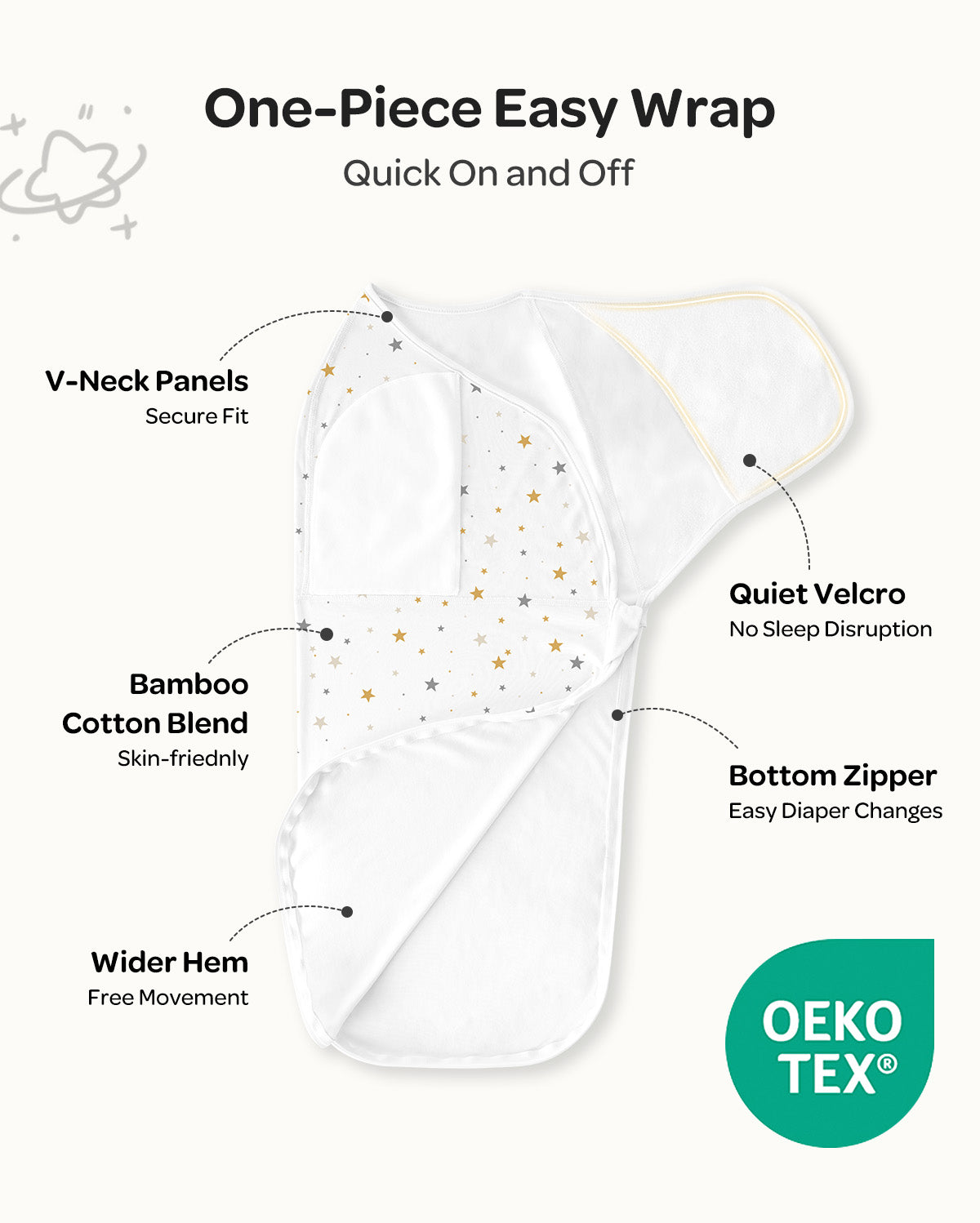 The swaddle wrap's one-piece design provides a comforting, womb-like feeling. The stretchy bamboo fabric and snug fit gently keep your baby's arms close to their body, which helps to reduce the moro (startle) reflex and allows for a more peaceful, restful sleep.