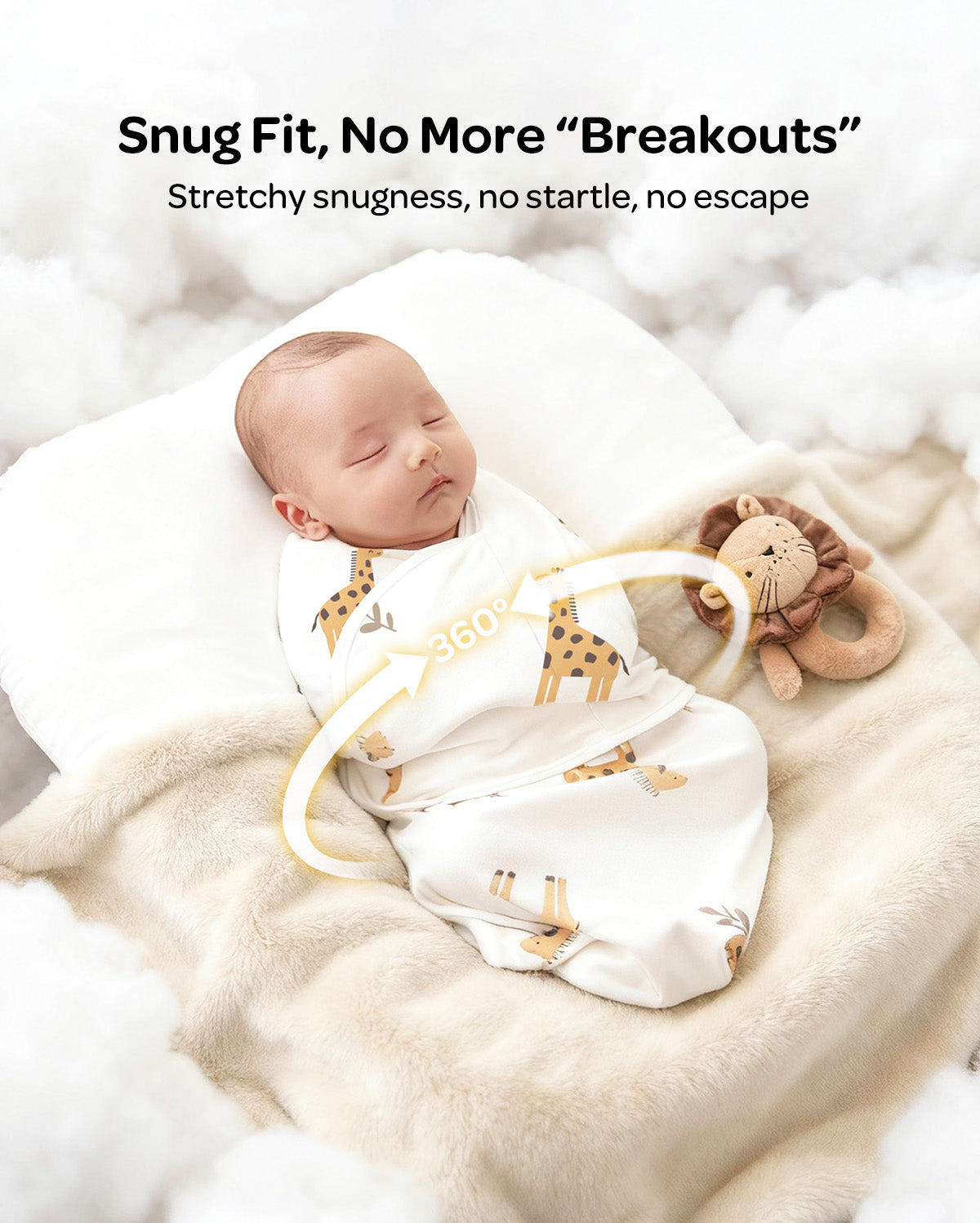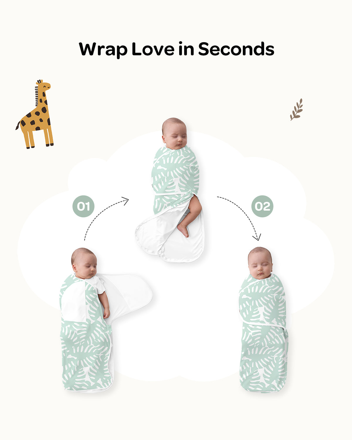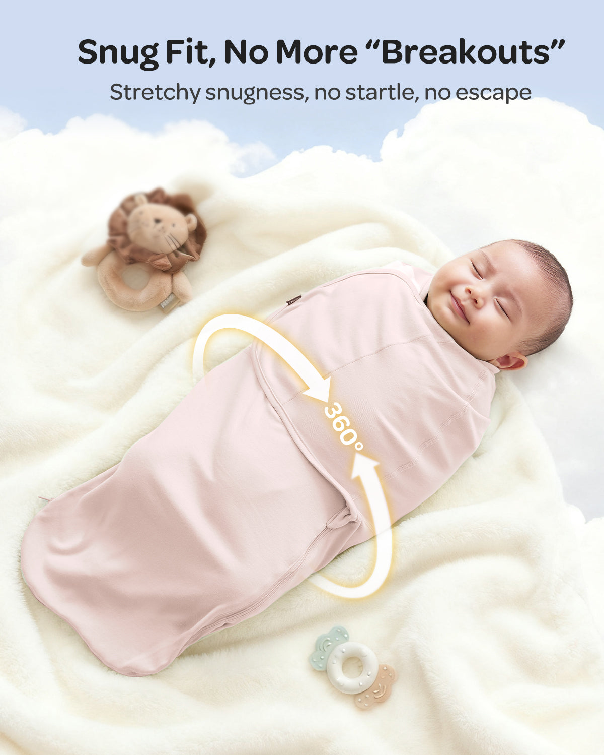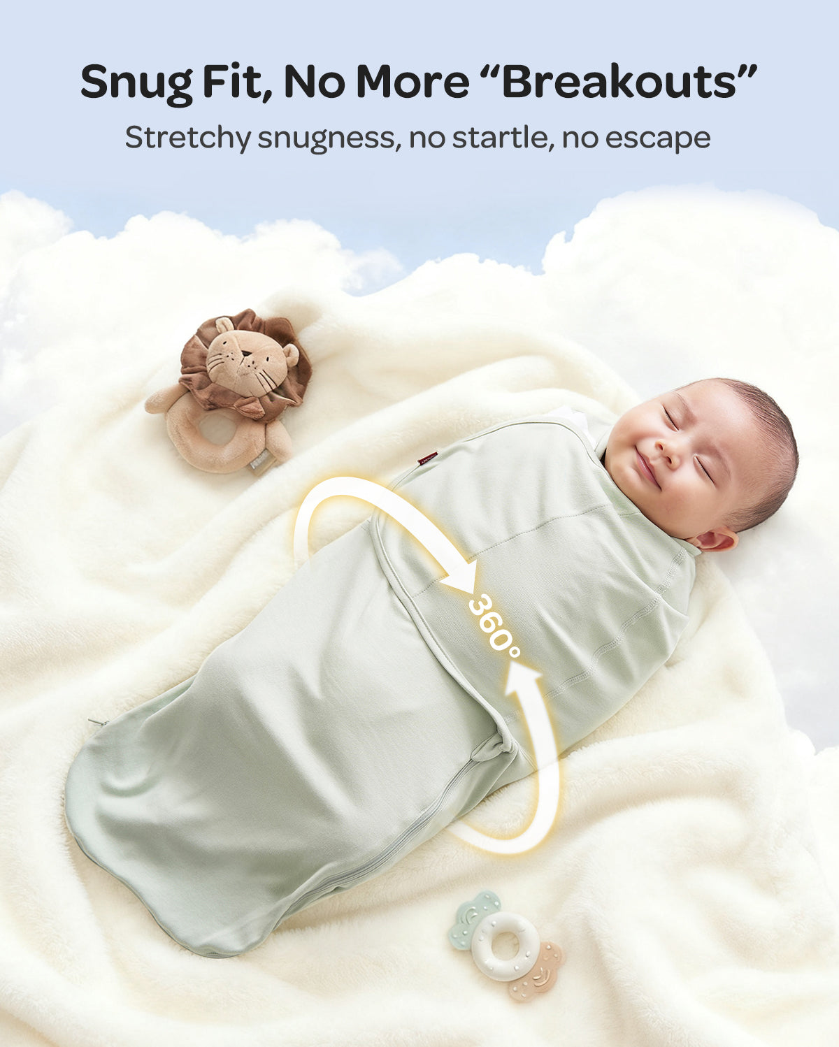The swaddle wrap's one-piece design provides a comforting, womb-like feeling. The stretchy bamboo fabric and snug fit gently keep your baby's arms close to their body, which helps to reduce the moro (startle) reflex and allows for a more peaceful, restful sleep.