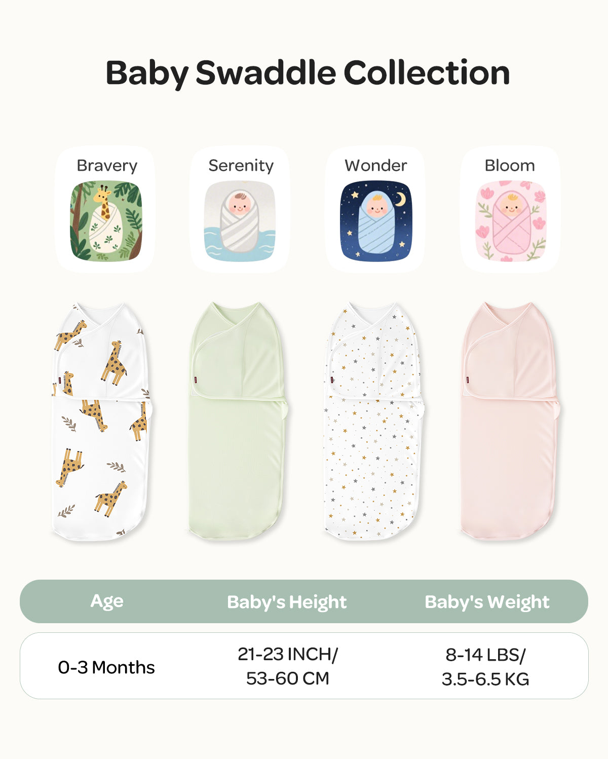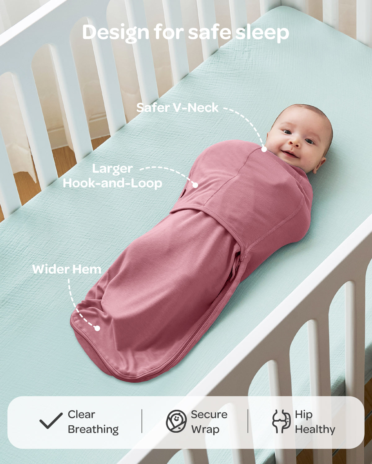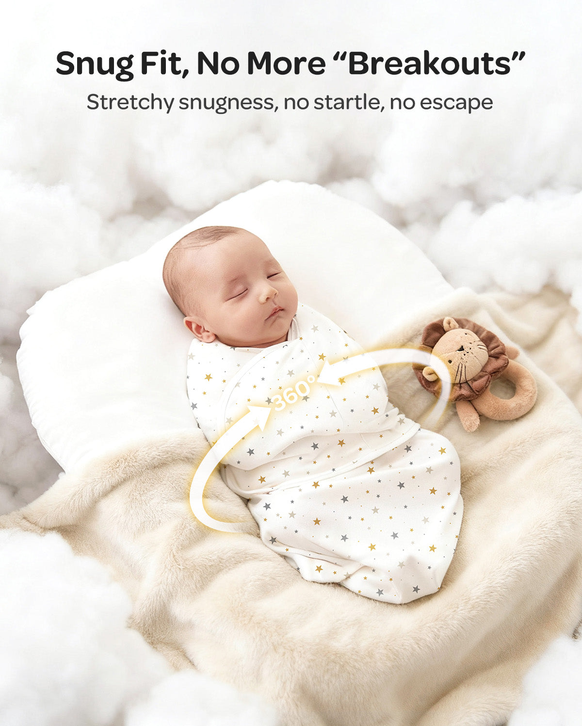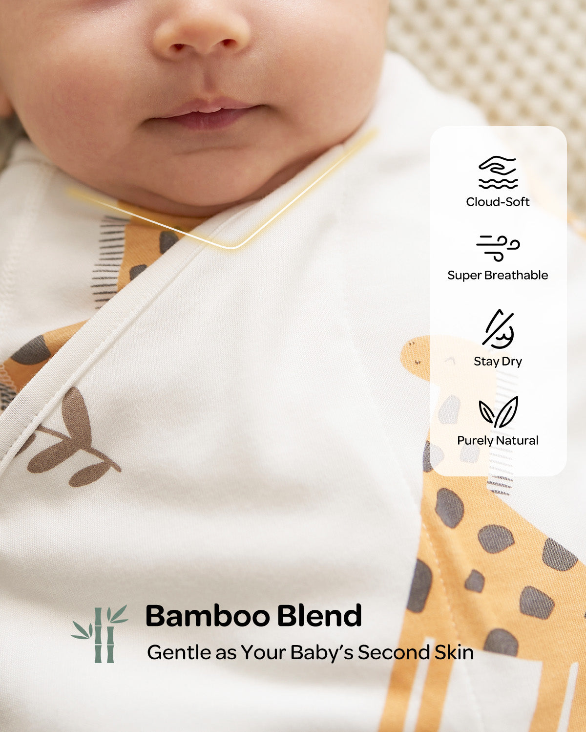 The swaddle wrap's one-piece design provides a comforting, womb-like feeling. The stretchy bamboo fabric and snug fit gently keep your baby's arms close to their body, which helps to reduce the moro (startle) reflex and allows for a more peaceful, restful sleep.