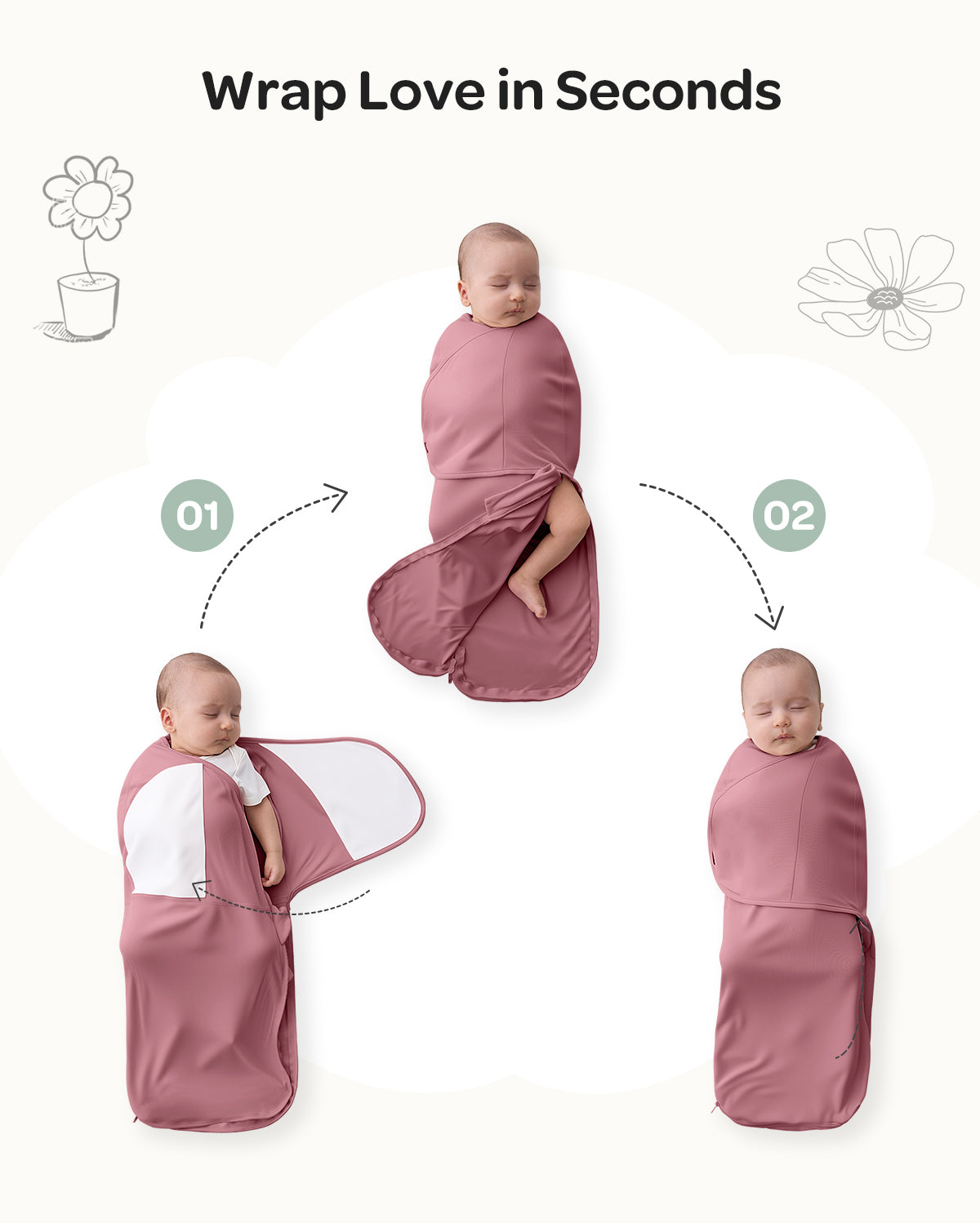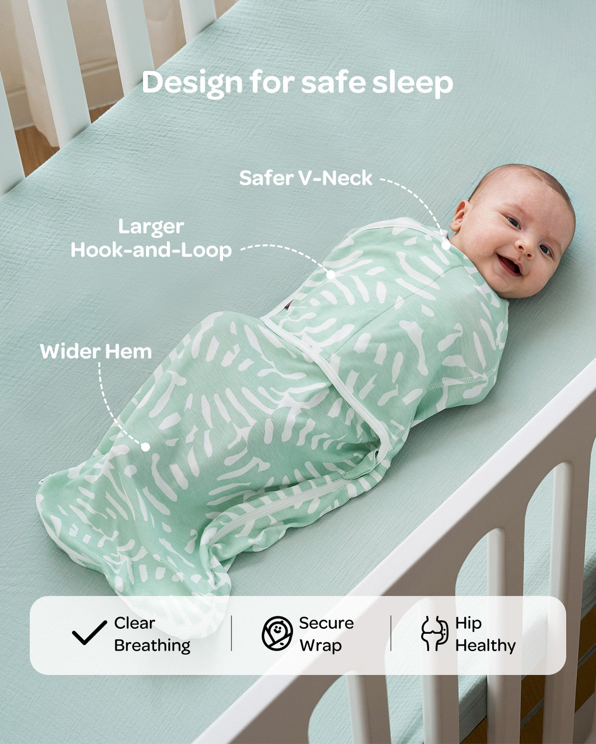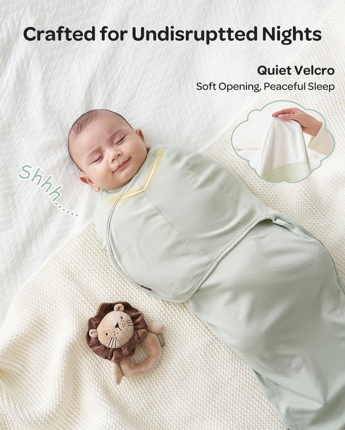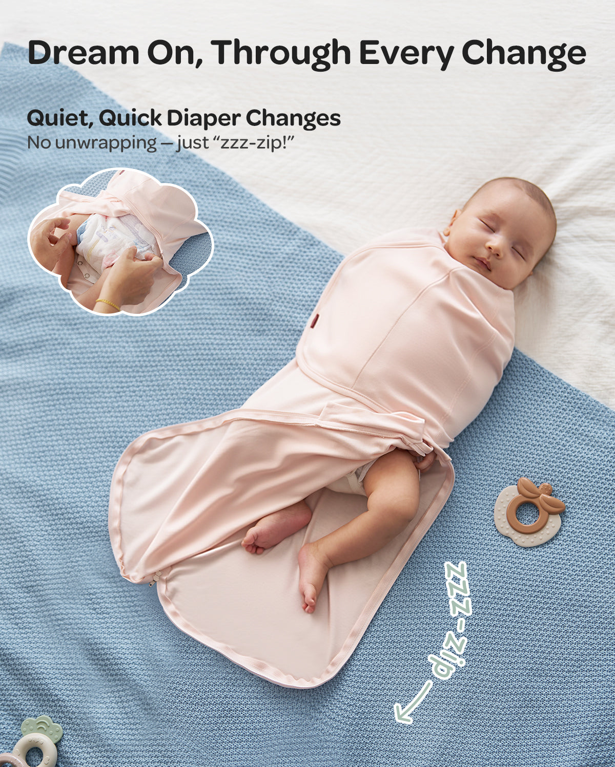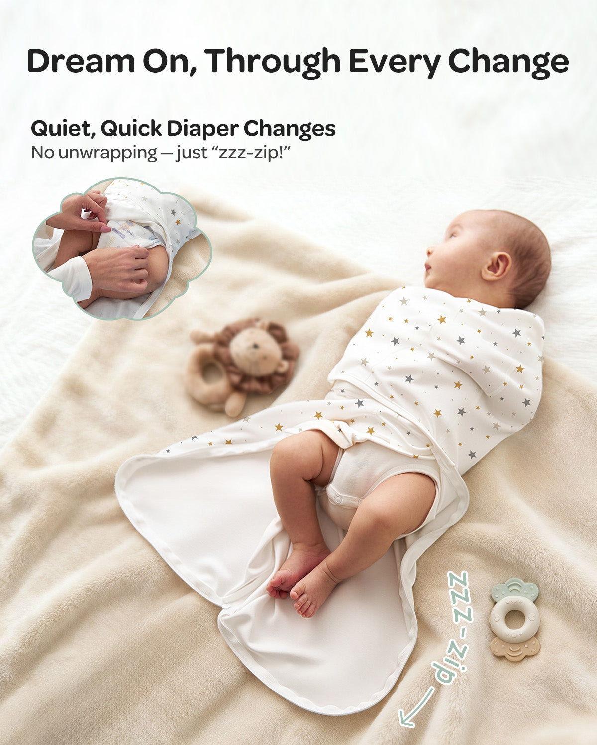 2-Step Swaddle: Silent hook-and-loop fastener plus bottom zipper for quick, fuss-free wrapping.