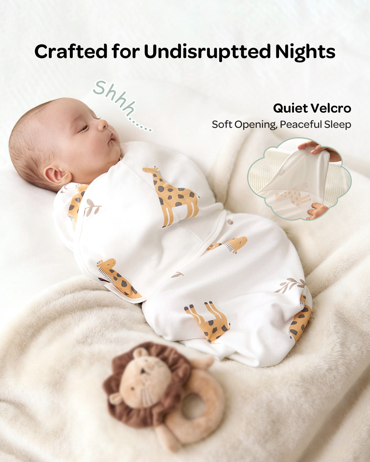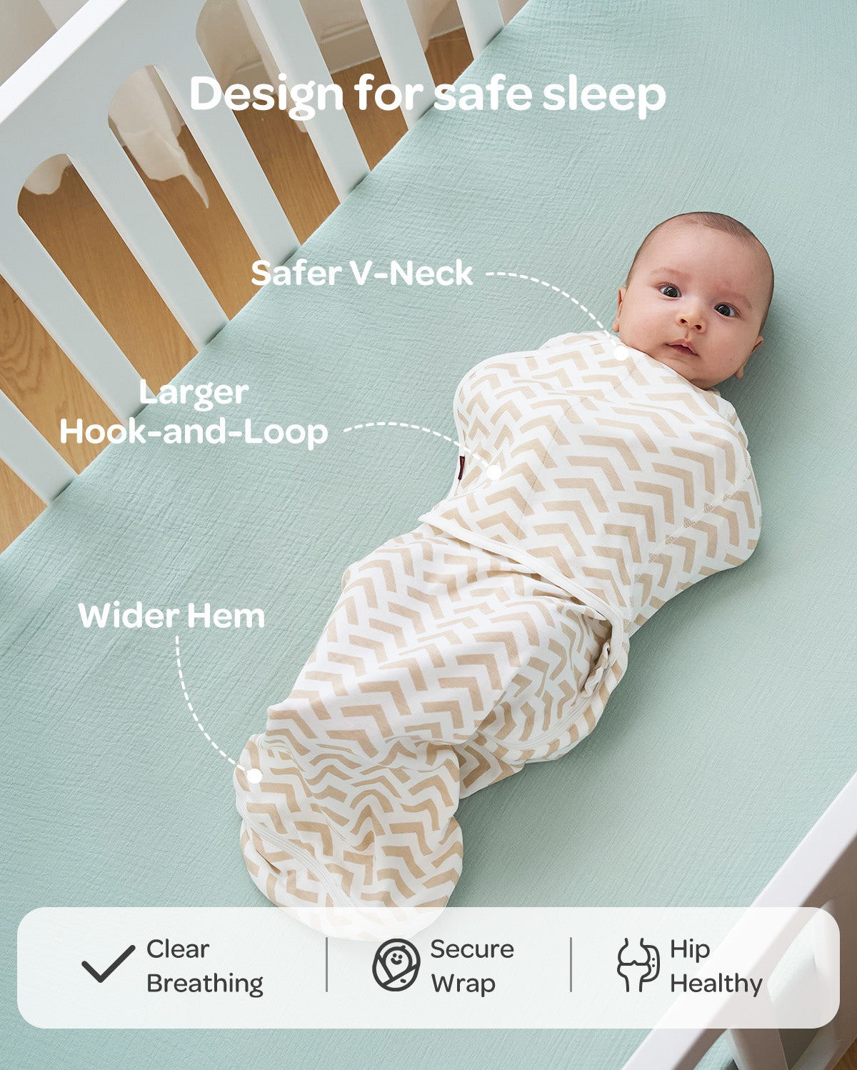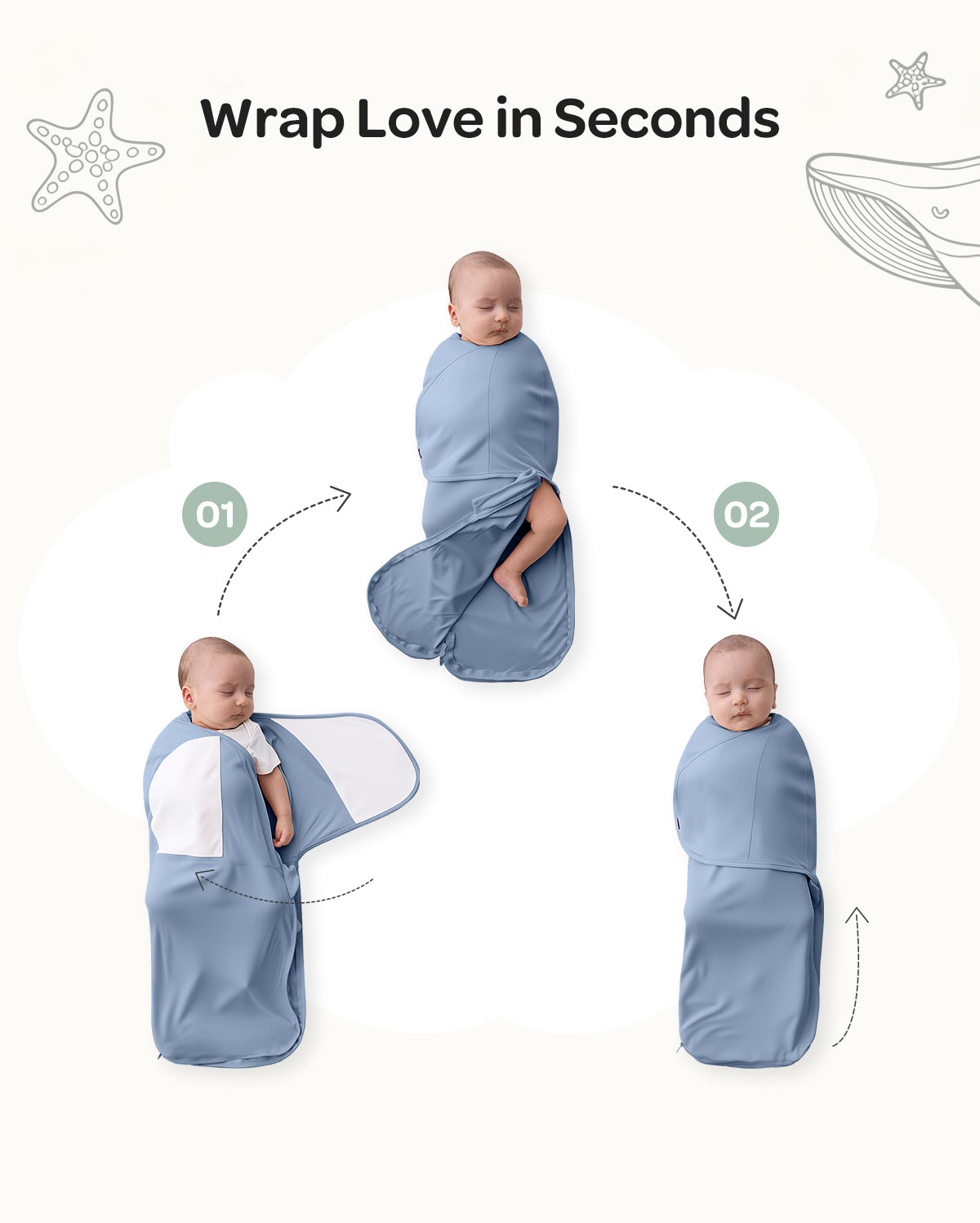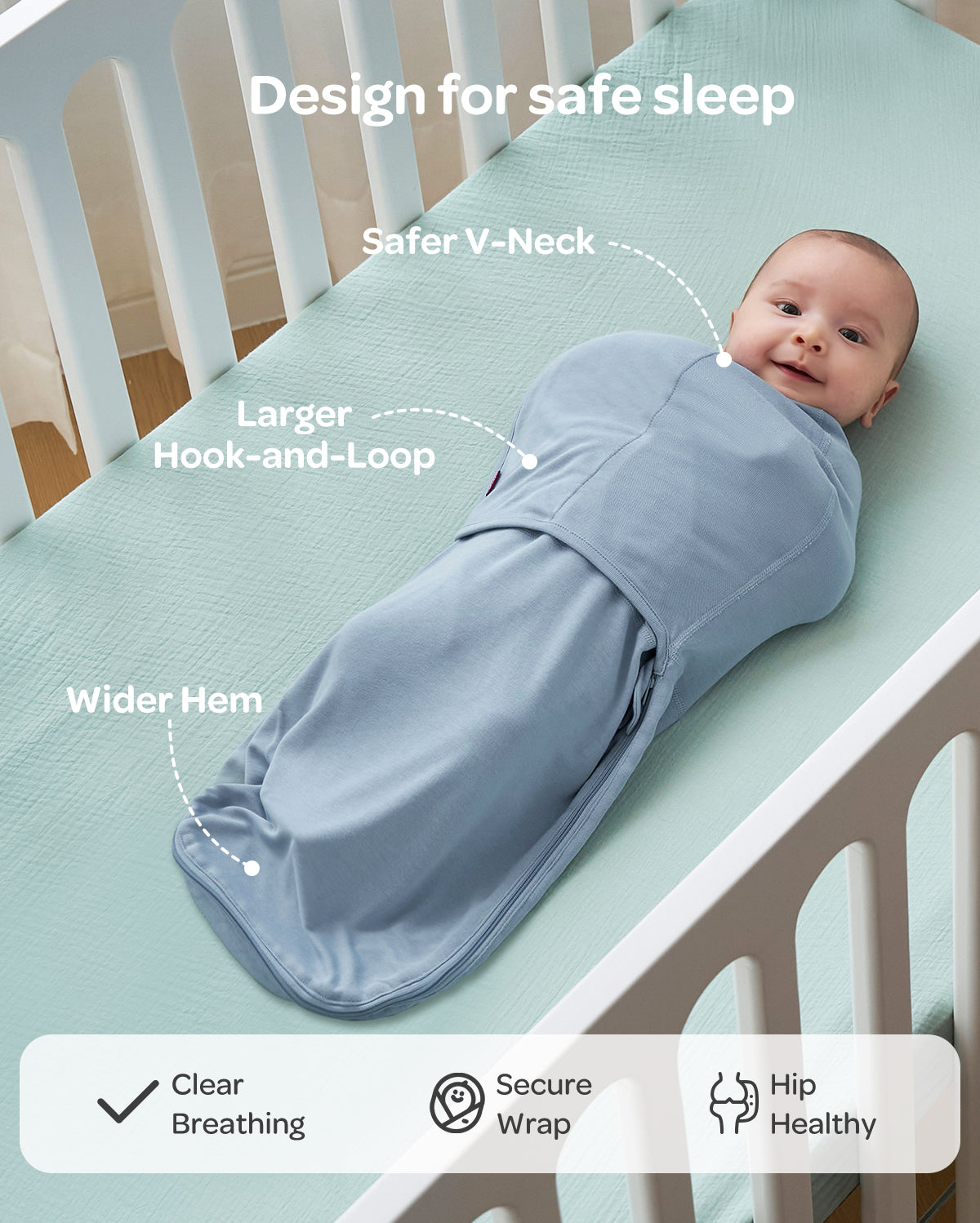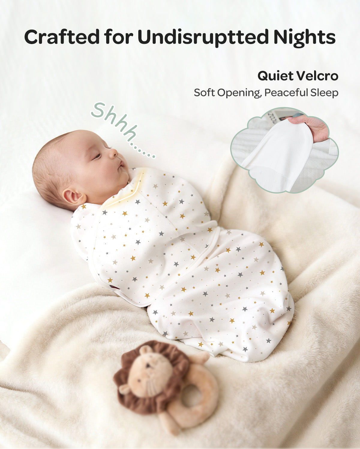 2-Step Swaddle: Silent hook-and-loop fastener plus bottom zipper for quick, fuss-free wrapping.