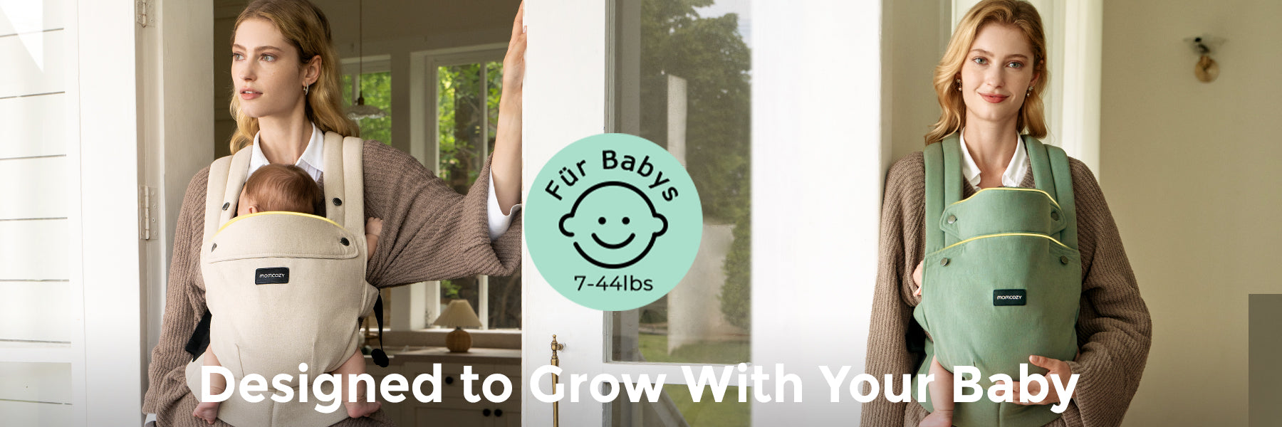 Momcozy baby carrier, beige, for newborns 7-44lbs. Promotes close connection and natural bonding with baby.