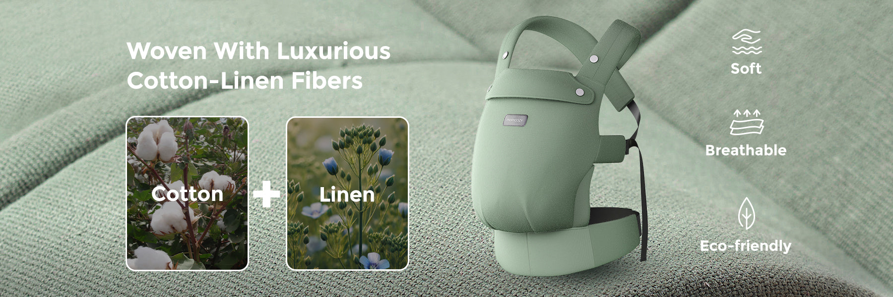 Sage green Momcozy PureHug baby carrier, cotton-linen, promoting breathable and eco-friendly babywearing.