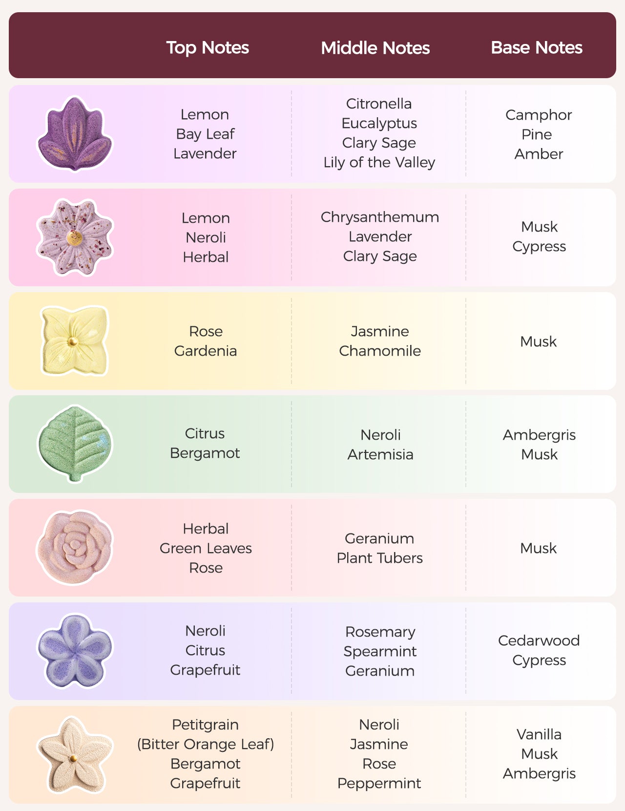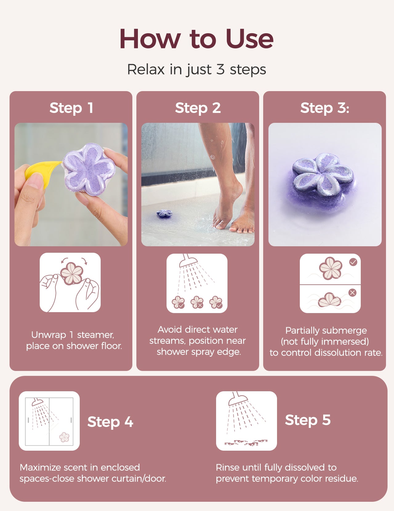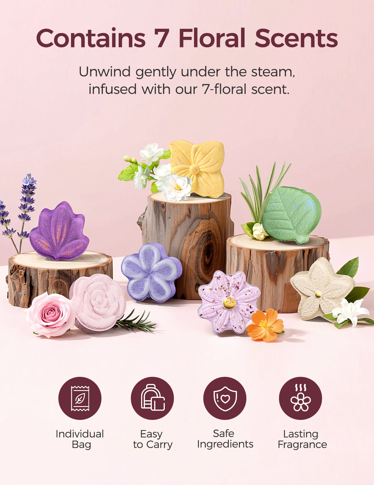 Match your mood to your shower. Our floral steamers come in 7 flower shapes, each with a dedicated scent. Transform