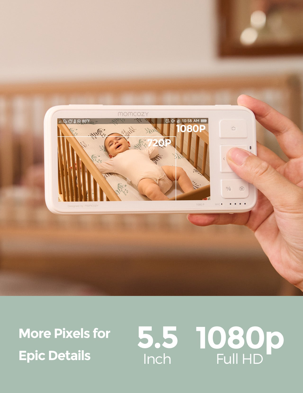 Presentamos el nuevo vigilabebés con vídeo Momcozy (BM03), diseñado tanto para padres primerizos como para padres ocupados, que adopta la esencia de la «crianza inteligente». La gran pantalla de 5,5 pulgadas y alta resolución 1080P ofrece una visión cristalina de su bebé en todo momento, mientras que la gran batería de 5800mAh dura día y noche. La potente señal soporta un impresionante alcance de 1640 pies y es imparable por 2 paredes, por lo que puede comprobar cómo está su pequeño en la cocina o en el salón. Además, nuestro vigilabebés con vídeo puede detectar el movimiento del bebé, grabar vídeos de un minuto y guardarlos en la tarjeta de almacenamiento SD incluida para reproducirlos más tarde. También puede capturar una foto con sólo pulsar un botón. Así no se perderá los momentos especiales de su bebé.