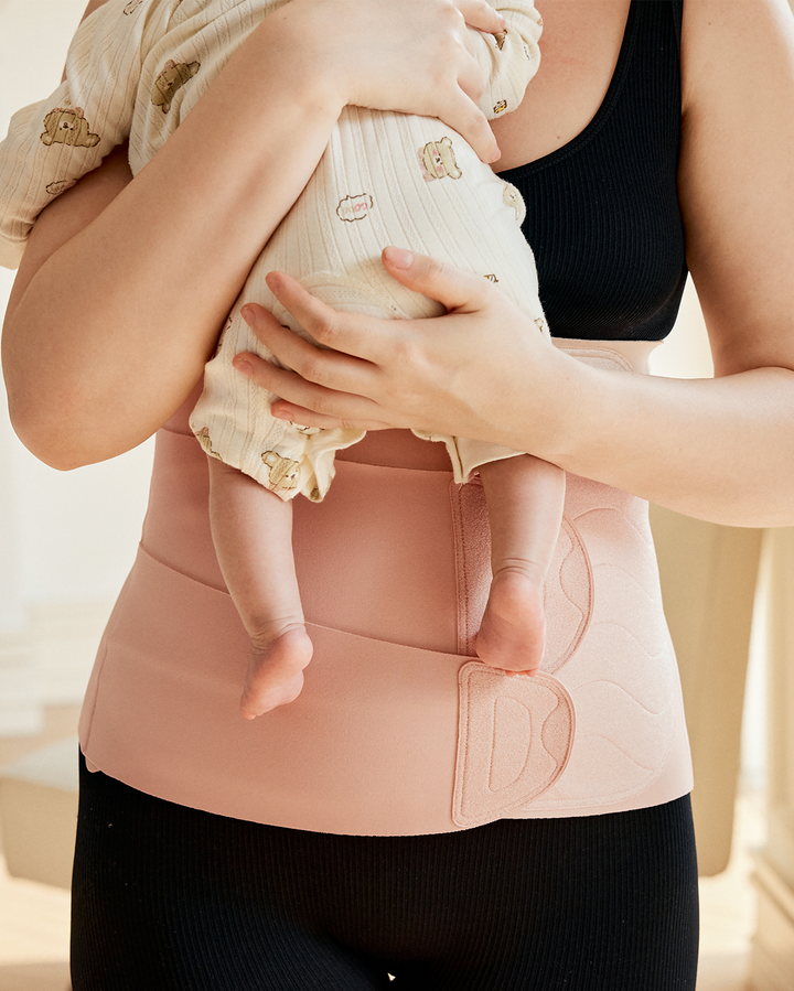 Momcozy Ergowrap Postpartum Belly Band in oyster pink color worn by a woman, with adjustable straps for postpartum support.