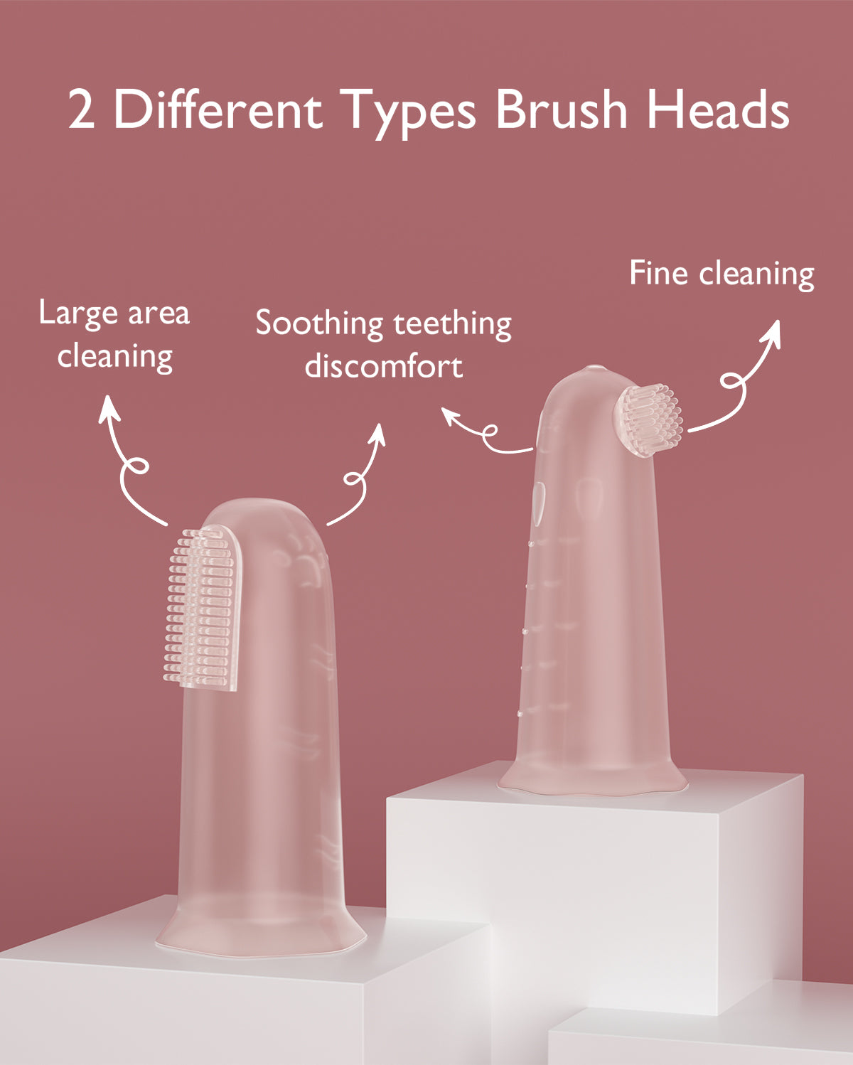 - 2 cabezales de cepillo diferentes - El cepillo de dedo de silicona de Momcozy incluye 2 cabezales distintos: uno alargado, ideal para una limpieza rápida de áreas grandes, y uno redondo para trabajar cuidadosamente en zonas con residuos difíciles.