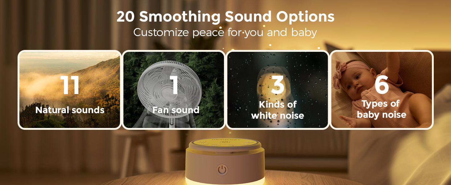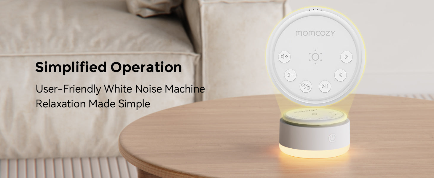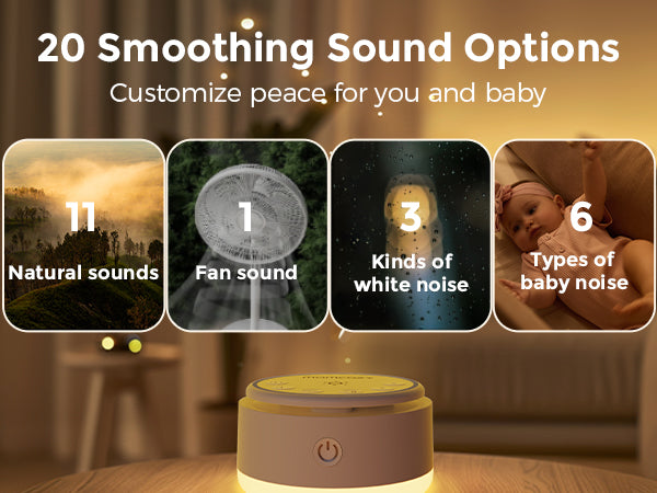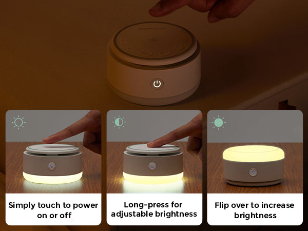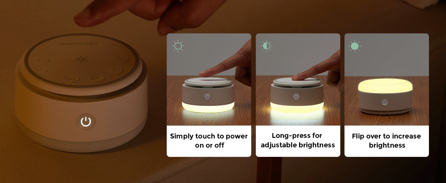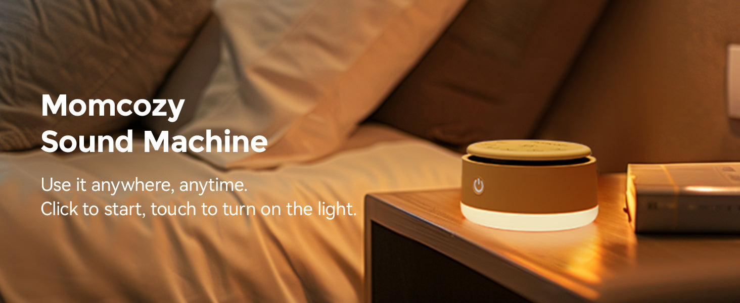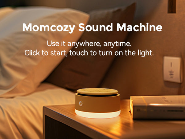 Discover tranquility with the Momcozy white noise machine . Boasting 20 high-fidelity white noise sounds , it effortlessly harmonizes with your sleep routine.Simply touch the top to turn on the light, and long-press to adjust the infinite brightness. With Momcozy, serene nights and refreshed mornings await.