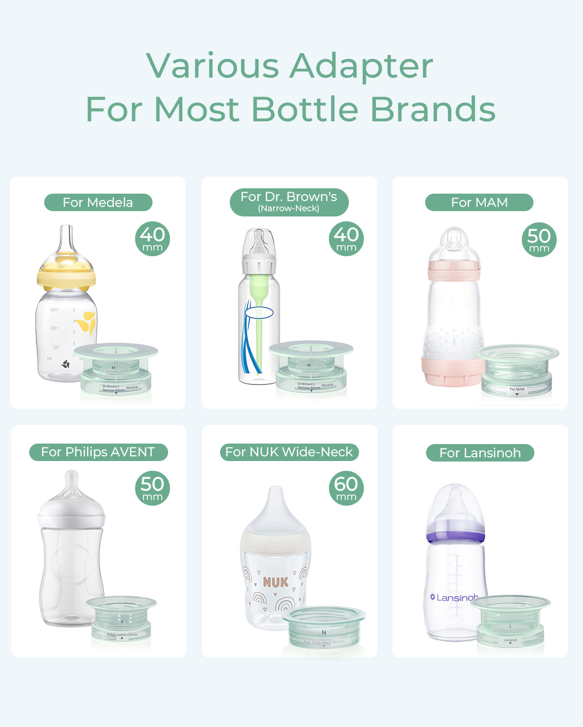 Incluye 5 adaptadores para las principales marcas de biberones. 01 se adaptan a Philip Avent/ Chicco 02 se adaptan a Tommee Tippee 03 se adaptan a Comotomo / Boon 04 se adapta a Dr. Brown's Narrow 40mm / Medala 40mm 05 adaptar a Dr. Brown's Wide-Neck 50mm
