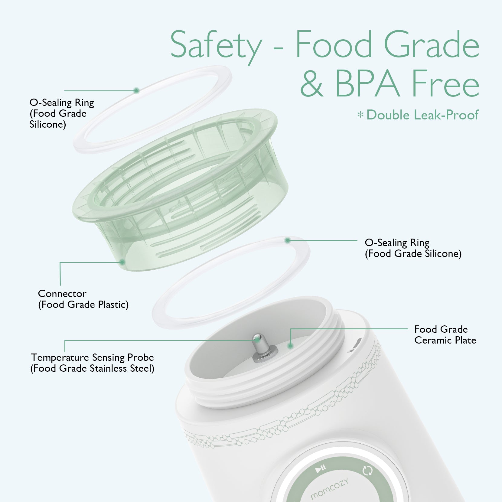 El calientabiberones portátil está fabricado con materiales de calidad alimentaria para garantizar la seguridad del bebé, y retiene los nutrientes de la leche sin olores ni sustancias nocivas. El calientabiberones portátil Momcozy cuenta con una placa calefactora de cerámica que garantiza un calentamiento rápido y uniforme de la leche, y el sensor de contacto de acero inoxidable y un doble anillo de silicona para evitar fugas y proporcionar una pantalla LCD de temperatura en tiempo real sin preocuparse por el sobrecalentamiento.