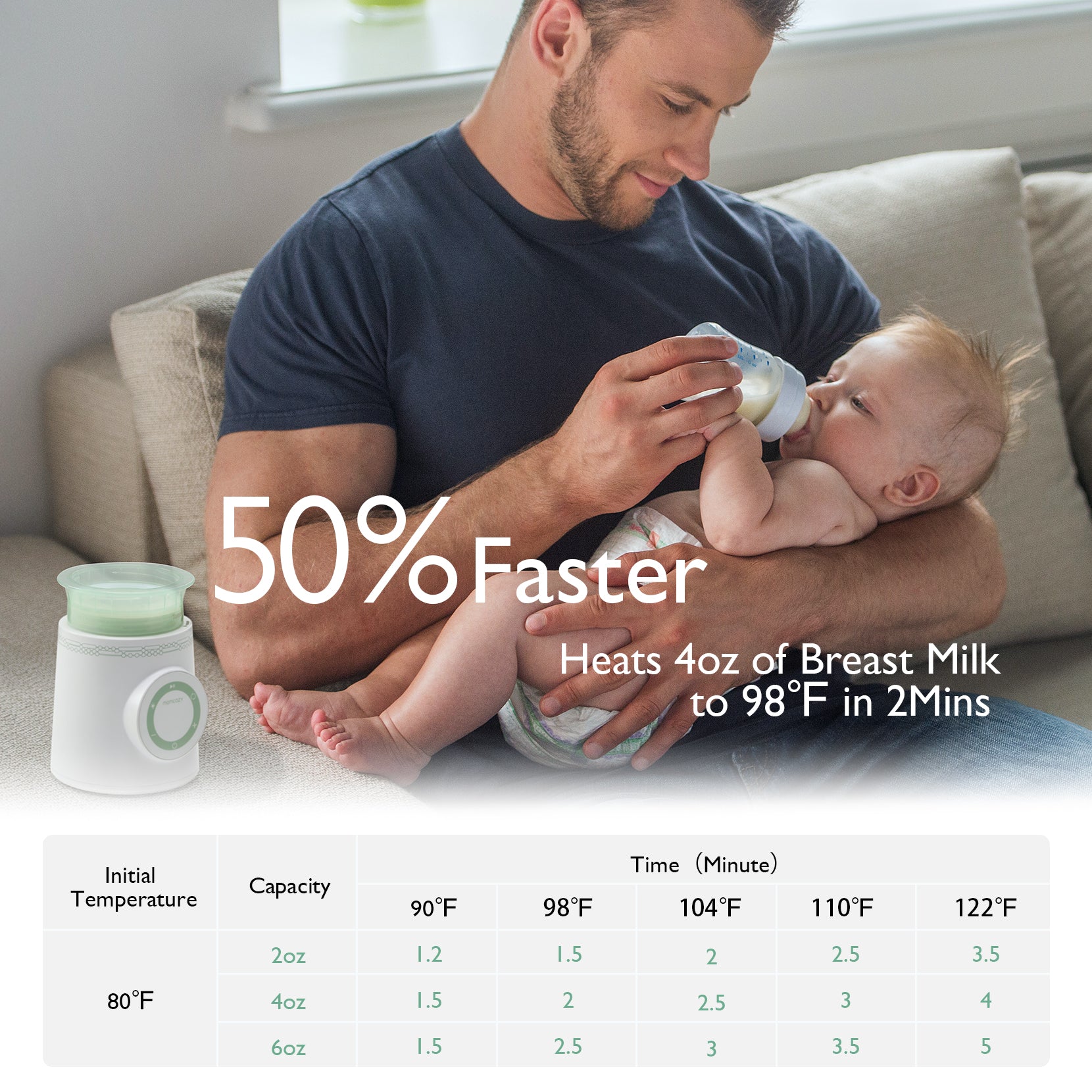 El calientabiberones portátil tiene una función de calentamiento rápido que calienta 4oz/120ml de leche a 98℉ en sólo 2 minutos.